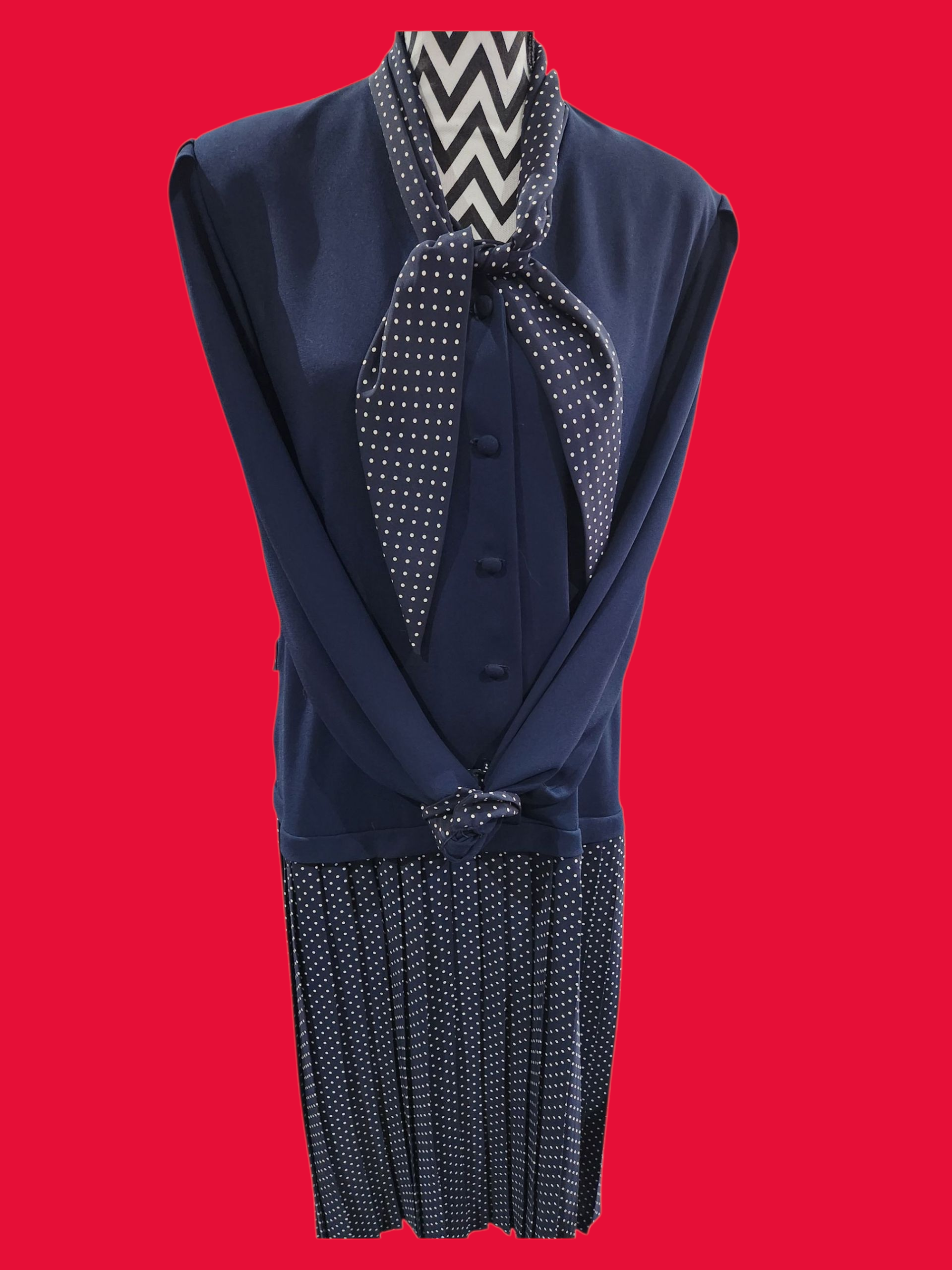 Dolina navy pleated drop waist dress with polka dots and pussy bow.